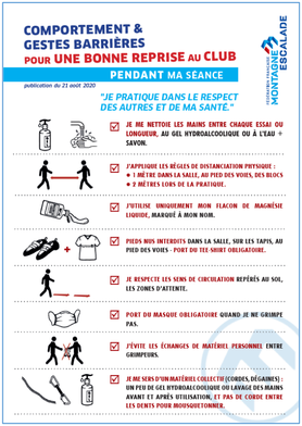 - Venez en tenue de sport, utilisez et marquez votre matériel (assurage, gourde, etc). Les vestiaires ne seront pas disponibles. (Des emplacements sont matérialisés dans les salles pour déposer vos effets personnels)