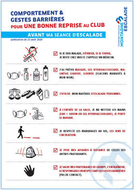 - Respectez la distanciation au pied des murs et gardez 2m entre chaque grimpeur et 1m entre chaque assureur…